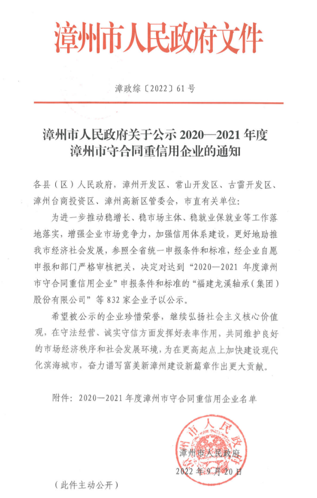 近日,漳州市人民政府印发了《关于公示2020—2021年度漳州市守合同重信用企业的通知》(漳政综〔2022〕51号),金年会中国jinnian名列其中,荣获此项殊荣。